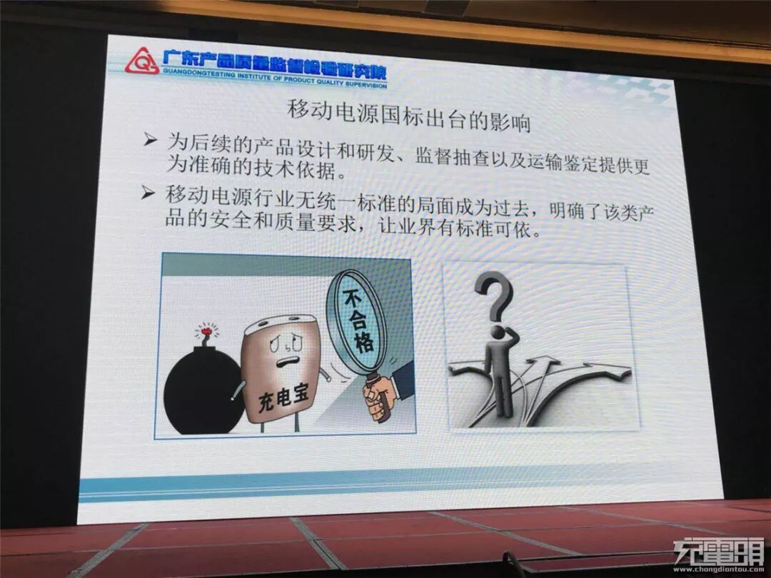 何龙平先分别从广东质检院介绍、移动电源发展历程、移动电源国标解析、总结及建议四个方面做了全面的讲解。