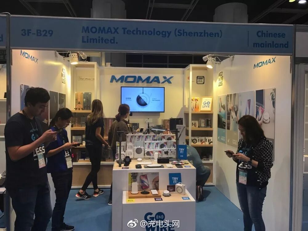 香港品牌momax展出独具创意的LED可移式灯具,产品特色在于内置了一个5W功率的无线充,将无线充产品的应用更加具体化。另外还展出一款水晶无线充,支持10W功率。Q.Pad无线充电枕支持两路无线充,每路功率最大10W。此外还有三角架镜头等热销产品展出。